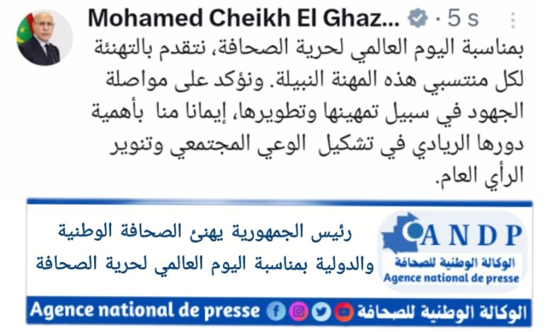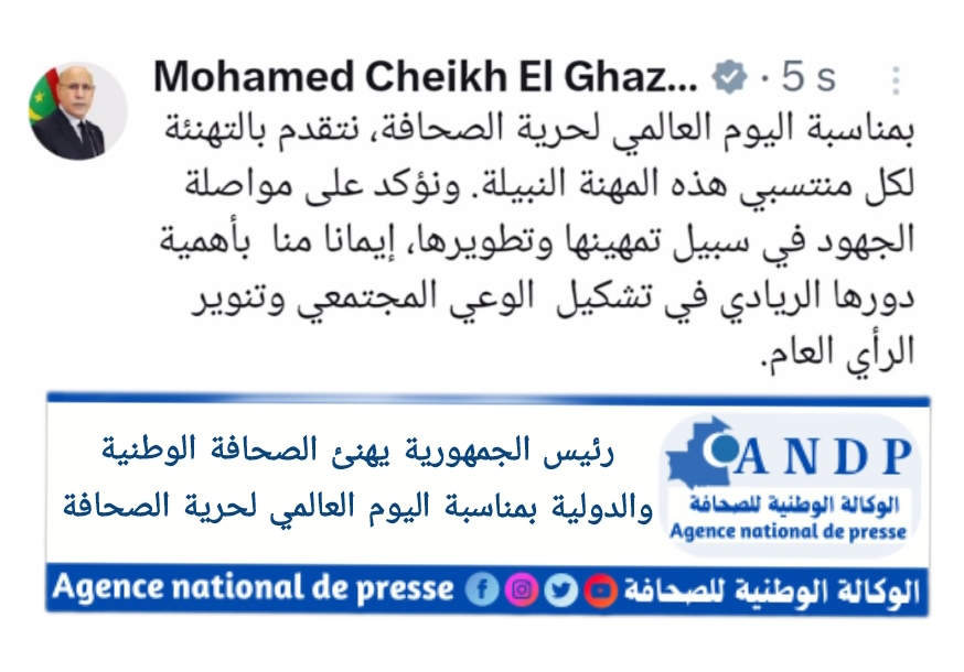 هنأ رئيس الجمهورية السيد محمد ولد الشخ الغزواني منتسبي مهنة الصحافة بمناسبة حلول يومهم العالمي.