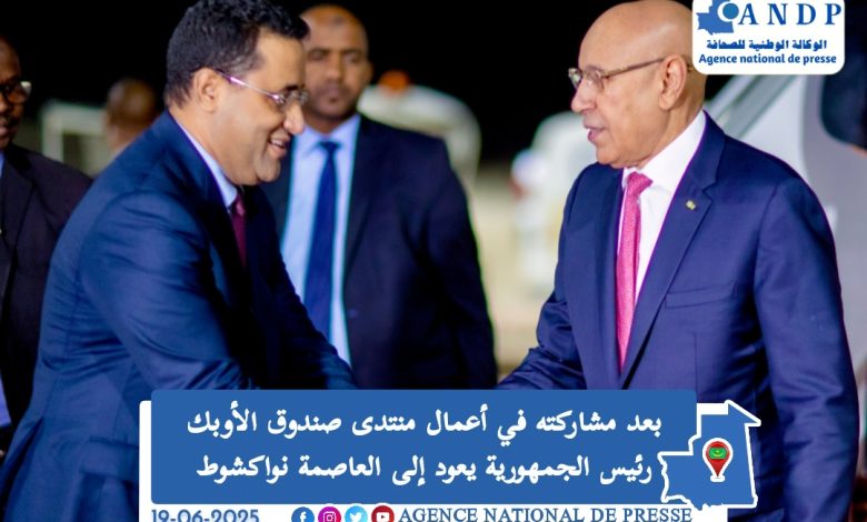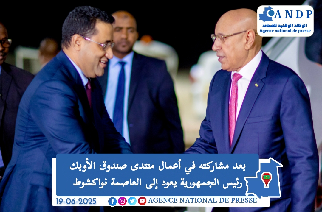 عاد رئيس الجمهورية السيد محمد ولد الشيخ الغزواني، إلى نواكشوط مساء اليوم، بعد، زيارة للعاصمة النمساوية فيينا، شارك خلالها كضيف شرف في أعمال منتدى صندوق الأوبيك للتنمية الدولية برسم سنة 2025