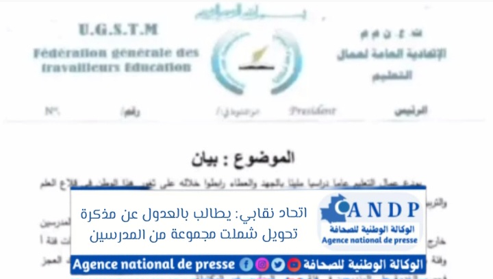 طالب الاتحاد العام لعمال التعليم في بيان صادر أمس الأربعاء، وزارة التربية بالعدول عن مذكرة التحويل الصادرة بتاريخ 4 أكتوبر، والتي شملت مجموعة من المدرسين خارج أماكن عملهم الأصلية.