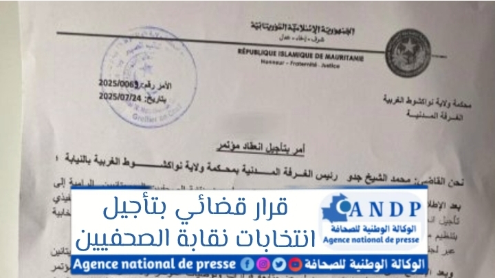 أمر رئيس الغرفة المدنية بمحكمة ولاية نواكشوط الغربية بالنيابة بتأجيل تنظيم المؤتمر العادي لنقابة الصحفيين الموريتانيين، والذي كان مقررا نهاية الشهر الجاري.