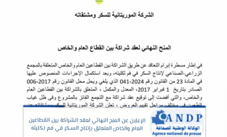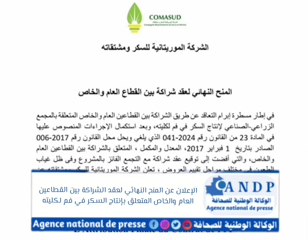 أعلنت الشركة الموريتانية للسكر ومشتقاته عن منح العقد النهائي للشراكة بين القطاعين العام والخاص لتنفيذ مشروع المجمع الزراعي الصناعي لإنتاج السكر في فم لكليته.
