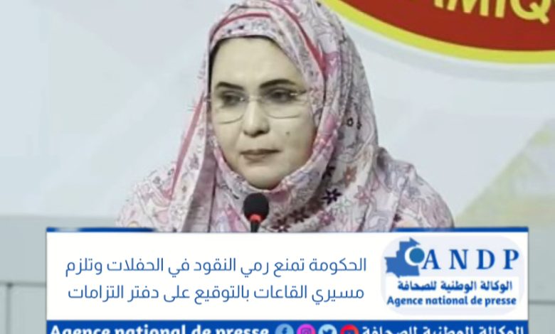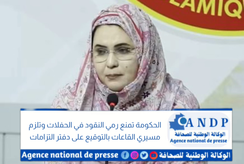 أعلنت وزيرة التجارة، زينب منت أحمدناه، اليوم الثلاثاء، إصدار قرار يحظر رمي الأوراق النقدية في المناسبات الاجتماعية على مستوى قاعات الحفلات.