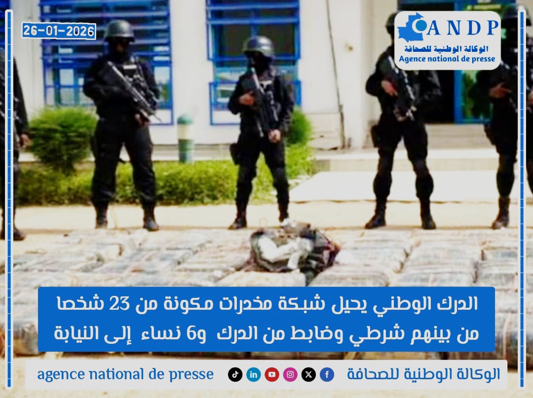 أحال الدرك الموريتاني اليوم الإثنين إلى النيابة العامة بنواكشوط الغربية شبكة تتألف من 23 مشتبها به بتهمة الحيازة والمتاجرة بالمخدرات ذات الخطر البالغ، وذلك بعد انتهاء التحقيقات الأولية معهم.