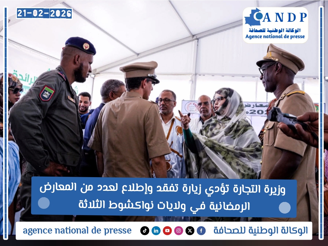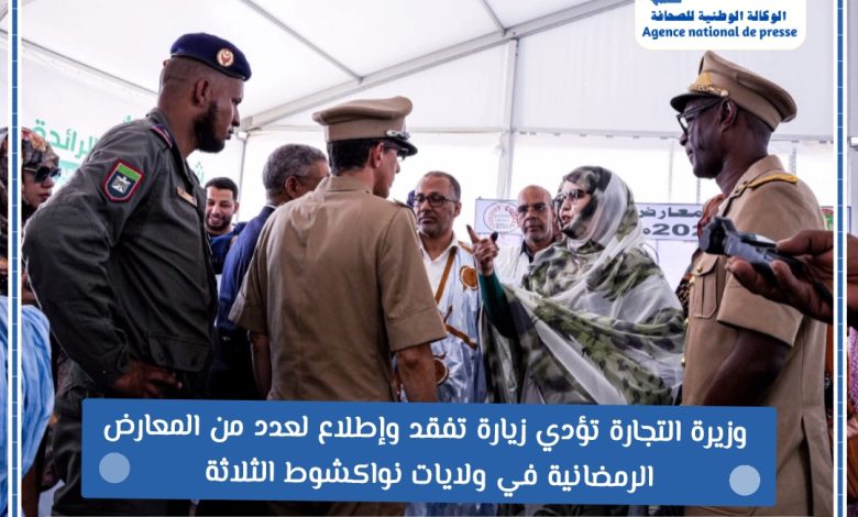 أدت وزيرة التجارة والسياحة، السيدة زينب بنت أحمدناه، رفقة ولاة ولايات نواكشوط الثلاث، ورئيس اتحاد أرباب العمل الموريتانيين، اليوم السبت، زيارة تفقد واطلاع لعدد من المعارض الرمضانية في ولايات نواكشوط الثلاث.
