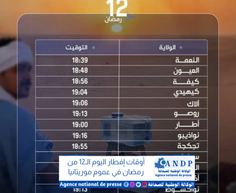 وهذه أوقات الإفطار في عواصم ولايات موريتانيا بالنسبة لليوم الثاني عشر من شهر رمضان 1447 ه.