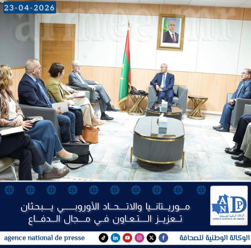 أجرى وزير الدفاع حننه ولد سيدي، اليوم الخميس بنواكشوط، مباحثات مع بعثة من الاتحاد الأوروبي برئاسة خواكين تاسو فيلالونغا، سفير الاتحاد الأوروبي المعتمد لدى موريتانيا.