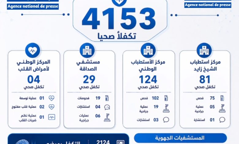 وفي تفاصيل باقي المؤسسات، سجل مركز الاستطباب الوطني 124 تكفلاً صحياً، منها 102 فحصاً و19 عملية جراحية و3 استشارات، بينما بلغ عدد التكفلات في مركز استطباب الشيخ زايد 81 تكفلاً، بينها 75 فحصاً و5 عمليات جراحية واستشارة واحدة.