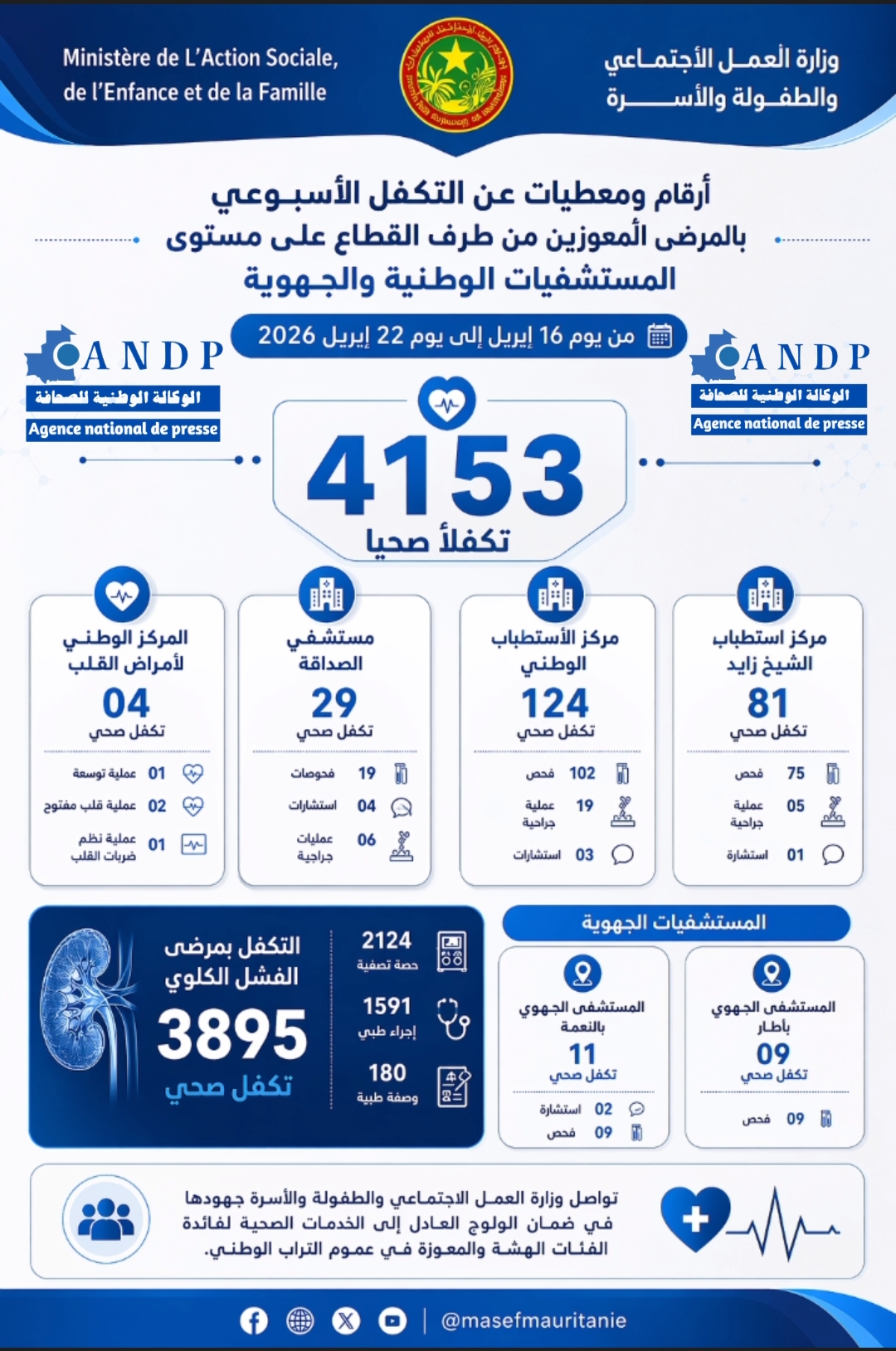 أعلنت وزارة العمل الاجتماعي والطفولة والأسرة عن تسجيل 4153 تكفلاً صحياً لصالح المرضى المعوزين، وذلك خلال الفترة الممتدة من 16 إلى 22 إبريل 2026، على مستوى المستشفيات الوطنية والجهوية.