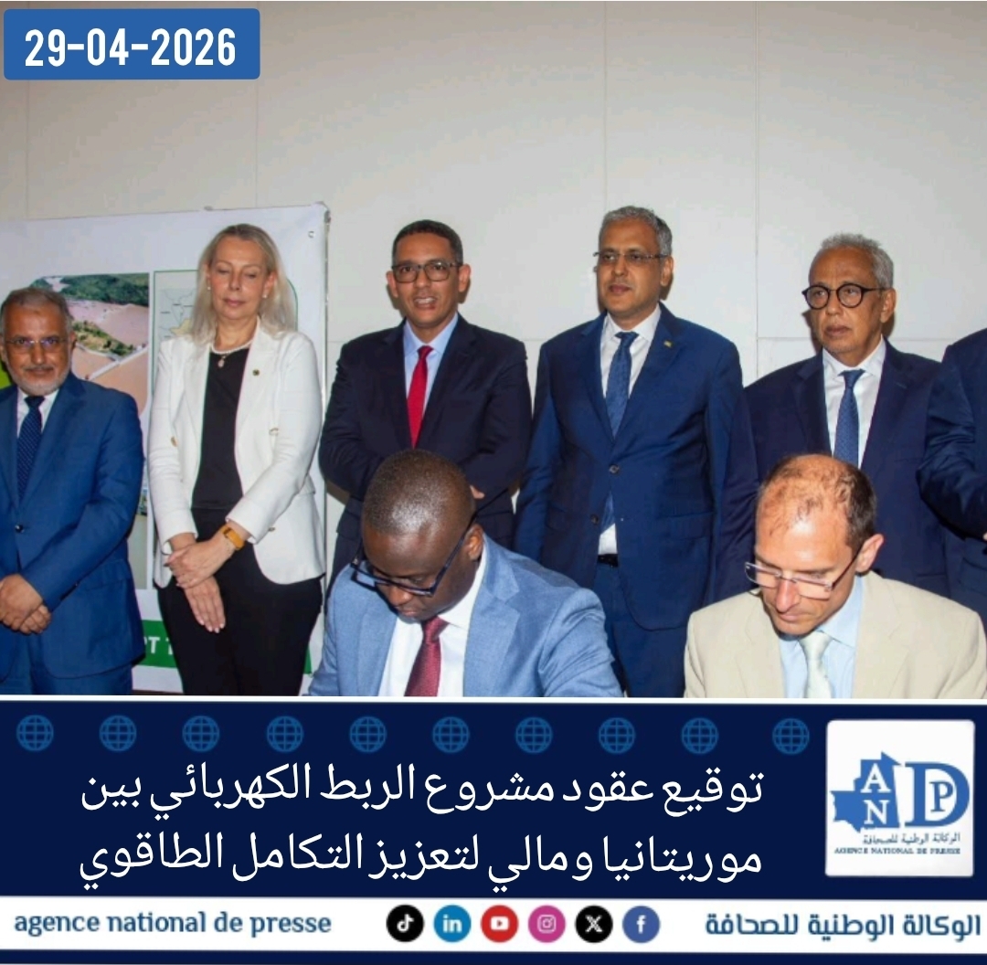 أشرف وزير الطاقة والنفط محمد ولد خالد ووزير الشؤون الاقتصادية والتنمية عبد الله ولد سليمان ولد الشيخ سيديا أمس الثلاثاء، على توقيع عقود تنفيذ مكونات أساسية من مشروع الربط الكهربائي بين موريتانيا ومالي.